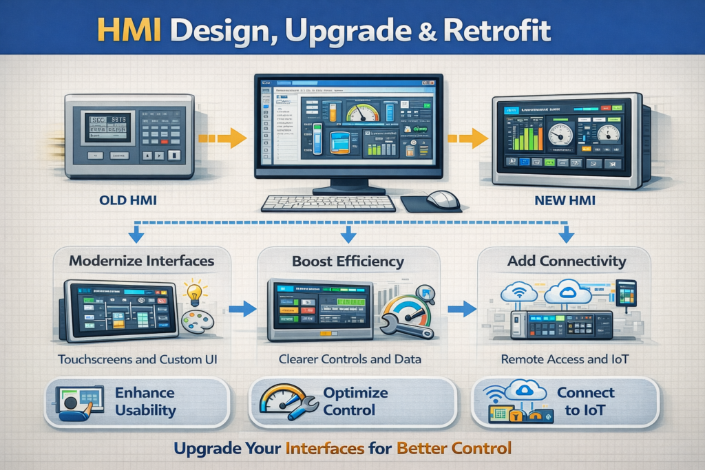 Our Human–Machine Interface design services create user-friendly touch screen interfaces for industrial automation systems. We develop customized HMI screens for monitoring, control, alarms, and real-time data visualization to enhance operator efficiency, machine performance, and production monitoring. 🖥️📊